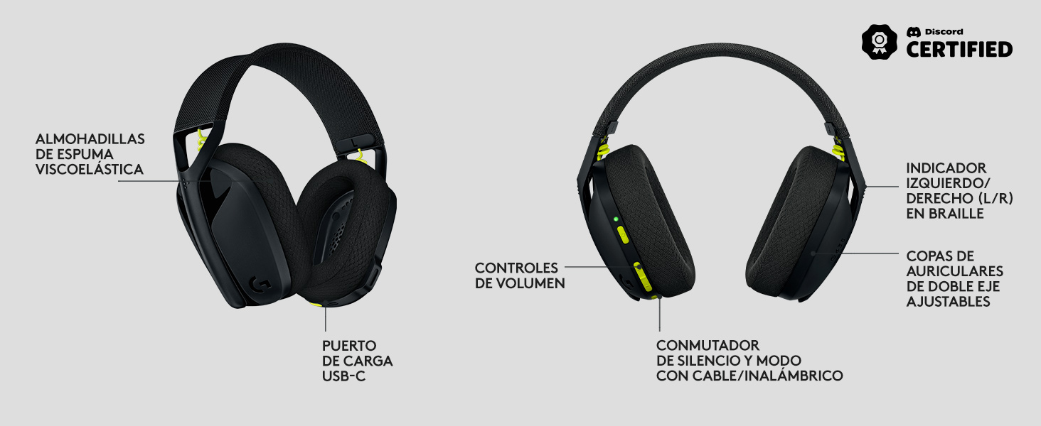 - Auriculares con micrófono G435, Receptor USB-A inalámbrico LIGHTSPEED, Cable de carga USB-C a USB-A, Documentación del usuario